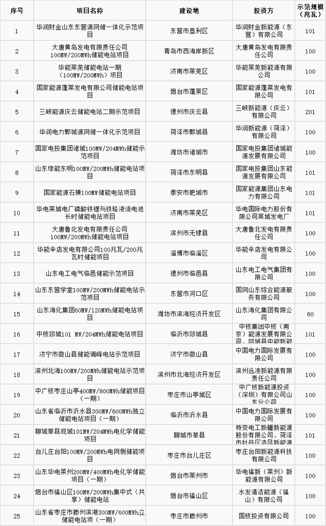 儲能在建設(shè)新型電力系統(tǒng)中具有重要地位,各地也紛紛布局儲能相關(guān)政策及示范項(xiàng)目,從而更好的推動(dòng)新型儲能建設(shè)的發(fā)展。4月7日,山東省能源局根據(jù)《關(guān)于開展2022年度儲能示范項(xiàng)目遴選工作的通知》精神,經(jīng)各市推薦和專家評審,擬將25個(gè)鋰電池類項(xiàng)目、4個(gè)新技術(shù)類項(xiàng)目列為2022年度儲能示范項(xiàng)目(具體名單見表格)。