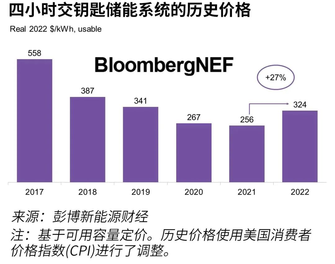 彭博新能源財(cái)經(jīng)2022年調(diào)研的交鑰匙儲(chǔ)能系統(tǒng)價(jià)格區(qū)間為每千瓦時(shí)212美元至575美元,四小時(shí)系統(tǒng)的全球平均價(jià)格比去年上漲27%至每千瓦時(shí)324美元。原材料和零部件價(jià)格上漲導(dǎo)致了儲(chǔ)能系統(tǒng)價(jià)格上漲,這也是自彭博新能源財(cái)經(jīng)于2017年開(kāi)始調(diào)研以來(lái)的首次上漲。預(yù)計(jì)成本將在2023年保持高位,然后在2024年下降。本報(bào)告匯總了提交的185份調(diào)研數(shù)據(jù),并且包括彭博新能源財(cái)經(jīng)對(duì)儲(chǔ)能成本的最新展望。