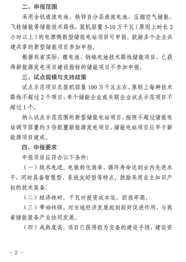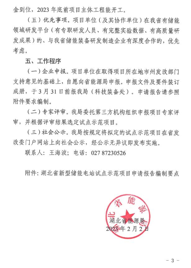 2月3日,湖北省能源局發(fā)布了《省能源局關(guān)于開(kāi)展新型儲(chǔ)能電站試點(diǎn)示范工作的通知》?!锻ㄖ繁硎?,本次試點(diǎn)釋放項(xiàng)目總裝機(jī)規(guī)模約1GW左右。原則上每種技術(shù)路線不超過(guò)2個(gè)項(xiàng)目;納入試點(diǎn)示范范圍的新型儲(chǔ)能電站項(xiàng)目,按照不超過(guò)儲(chǔ)能電池調(diào)節(jié)容量的5倍配置新能源發(fā)電項(xiàng)目。儲(chǔ)能電站項(xiàng)目應(yīng)早于新能源項(xiàng)目建成。申報(bào)截止時(shí)間3月31日。