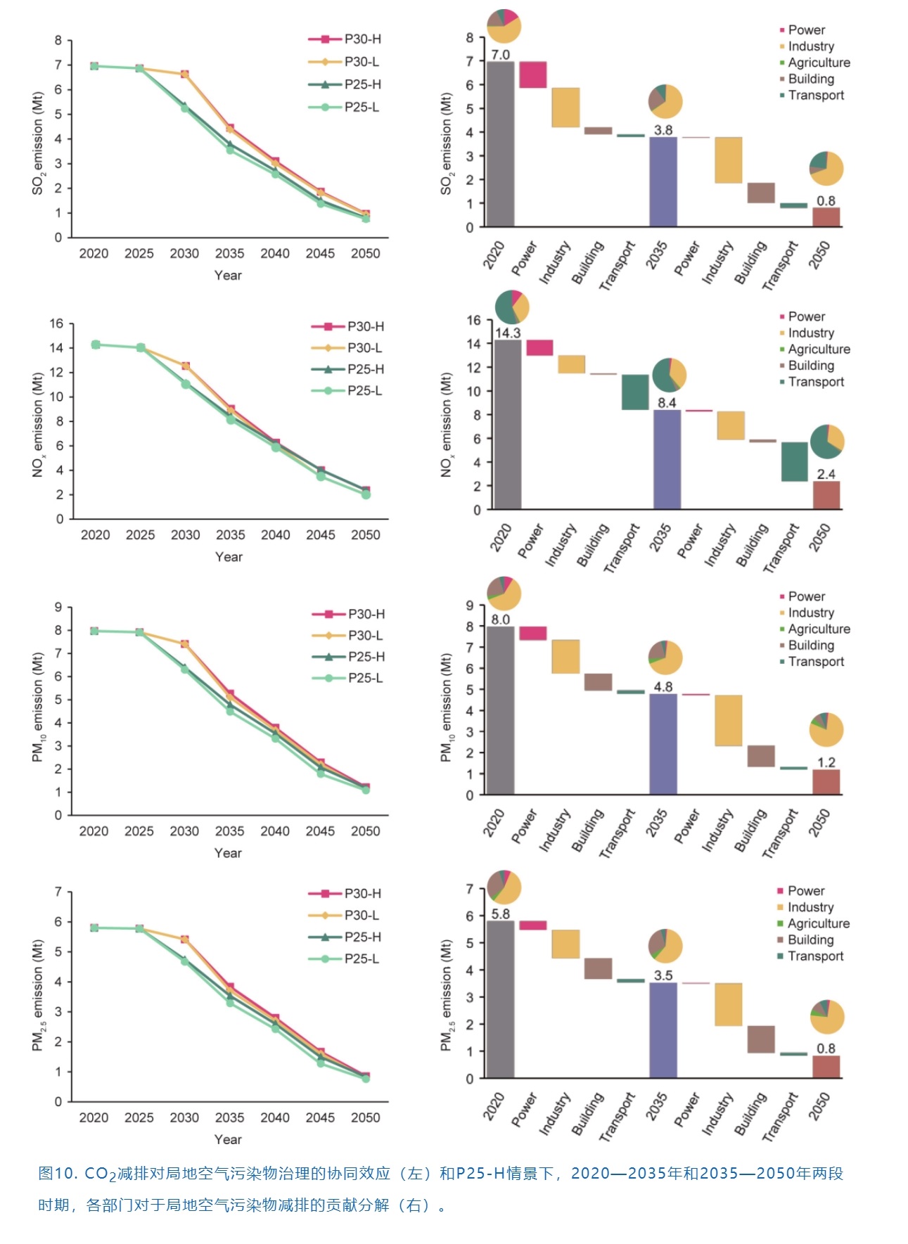 除此之外,能源轉(zhuǎn)型帶來(lái)以空氣質(zhì)量改善等為代表的顯著正外部性。在假設(shè)不采取新的局地空氣污染物控制措施情況下,僅通過(guò)二氧化碳減排就可以實(shí)現(xiàn)SO2、NOx、PM10和 PM2.5等空氣污染物大幅減少(圖10)。2020年,大部分的SO2來(lái)自于工業(yè)和電力部門。SO2排放由2020年的約700萬(wàn)噸減少到2050年的不足100萬(wàn)噸(P30)和80萬(wàn)噸(P25),工業(yè)部門是減排的重點(diǎn)。電力部門的脫碳在2035年之前起到了一定作用,而2035年以后減排主要源于需求部門的燃料替代。到2050年,工業(yè)部門和交通部門是SO2最大的排放者。