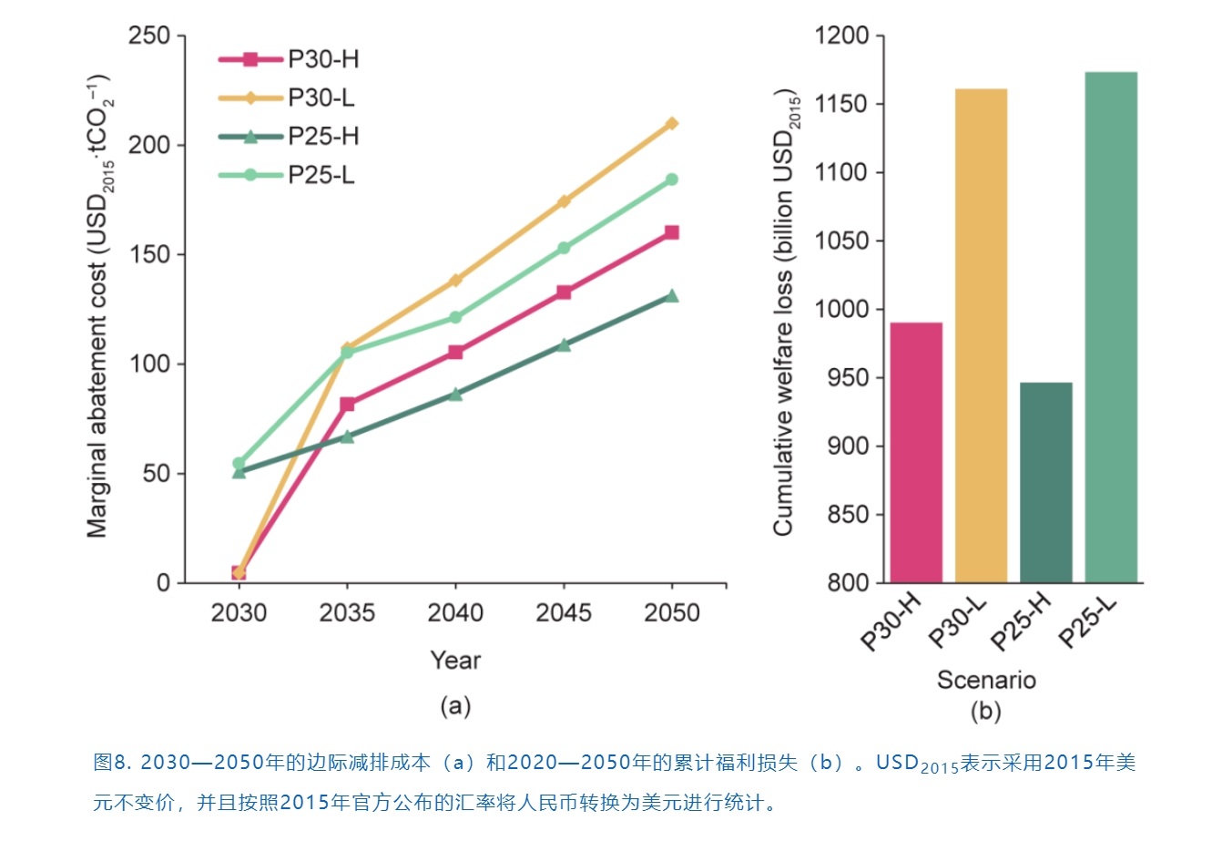 在P30情景下,在2030年實(shí)現(xiàn)國(guó)家自主貢獻(xiàn)目標(biāo)需要較小的努力[每噸二氧化碳(t CO2)花費(fèi)5 USD],然而遠(yuǎn)遠(yuǎn)未達(dá)到實(shí)現(xiàn)碳中和所需的努力。在P30-H情景下,2040年的MAC將增加到100 USD·t CO2-1以上;而對(duì)于P30-L,2035年的MAC就已經(jīng)超過(guò)100 USD·t CO2-1,到2050年將進(jìn)一步突破200 USD·t CO2-1。相比之下,由于P25在2030年已經(jīng)開(kāi)始實(shí)現(xiàn)碳排放的下降,2030年的MAC約為50 USD·t CO2-1。與P30-L情景類似,P25-L情景也將在2035年達(dá)到100 USD·t CO2-1的MAC,但是后續(xù)的增長(zhǎng)將放緩,2050年的MAC為184 USD·t CO2-1。由于P25-H轉(zhuǎn)型壓力最小,2045年以前該情景的MAC都不會(huì)超過(guò)100 USD·t CO2-1,到2050年MAC也僅131 USD·t CO2-1。