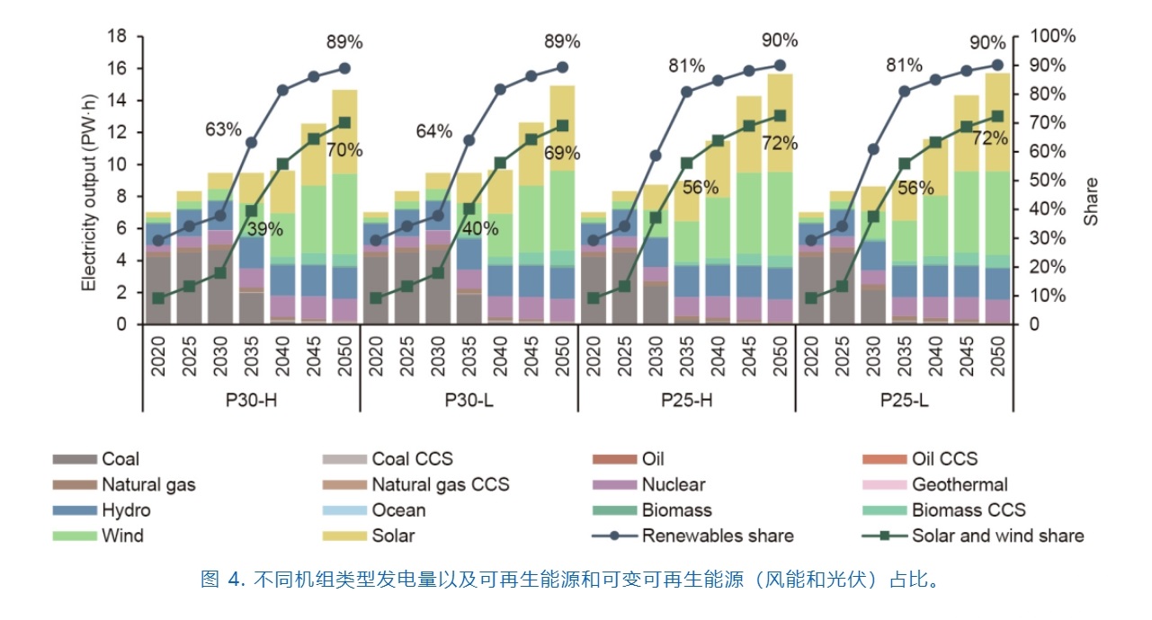 發(fā)電結(jié)構(gòu)的變化主要是因?yàn)槊弘姀S的退役和風(fēng)能及光伏發(fā)電的增加。可以預(yù)計(jì),煤電廠將很快進(jìn)入轉(zhuǎn)型最關(guān)鍵的10年。在此期間,煤電廠要么需要提前退役,要么將進(jìn)行靈活性改造以進(jìn)入輔助服務(wù)市場(chǎng),或者轉(zhuǎn)變?yōu)樯镔|(zhì)-煤混燃電廠甚至純BECCS電廠,從而能夠產(chǎn)生負(fù)排放。研究表明,碳達(dá)峰的時(shí)間在很大程度上取決于燃煤電廠退出發(fā)電序列的速度。比較P25和P30情景,發(fā)現(xiàn)近期需要盡快停止新建煤電廠并在合理范圍內(nèi)讓落后煤電廠有序退役。到燃煤電廠基本退出后,可再生能源發(fā)電量將占總發(fā)電量的81%,而以風(fēng)能和光伏為代表的可變可再生能源的比例將達(dá)到56%。對(duì)于P25情景,風(fēng)能和光伏的總裝機(jī)容量在2035年將達(dá)到3.1 TW,而對(duì)于P30情景,風(fēng)能和光伏在2040年的總裝機(jī)容量為3.4 TW。核能將成為電力系統(tǒng)的重要組成部分,未來(lái)可再生能源的滲透率會(huì)很高,其裝機(jī)容量將在未來(lái)20年增長(zhǎng)3倍以上。