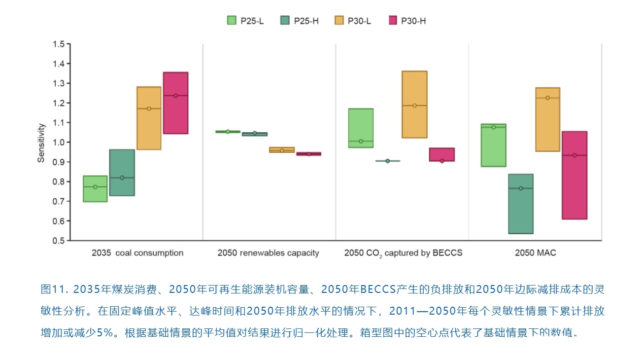 盡管BECCS技術(shù)的部署受到累計(jì)排放量變化的重大影響,但提前達(dá)峰能夠減少對(duì)碳移除技術(shù)的依賴并減少由累計(jì)排放量不確定性帶來(lái)的波動(dòng)。由于所有部門在2050年都已經(jīng)深度脫碳,因此所有情景都顯示出了對(duì)BECCS的巨大需求,其中P25-L和P30-L情景有更高的普及率。與碳移除技術(shù)類似,MAC受到累計(jì)排放量的影響較大。較晚達(dá)峰和更嚴(yán)格的長(zhǎng)期排放目標(biāo)都會(huì)增加MAC,產(chǎn)生更大的減排壓力,提前達(dá)峰能夠在實(shí)現(xiàn)長(zhǎng)期目標(biāo)中占據(jù)主動(dòng)地位。
