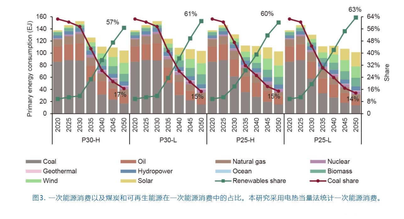 相比之下,可再生能源目前占一次能源消費(fèi)的10%,同時(shí)增長(zhǎng)緩慢,主要是為了滿足增量能源需求。未來(lái),可再生能源將最有希望填補(bǔ)由煤炭消費(fèi)下降造成的缺口,從而逐步取代化石燃料。據(jù)測(cè)算,在2035—2040年,可再生能源將超越化石燃料,成為中國(guó)最主要的能源。到2050年,中國(guó)一次能源消費(fèi)中可再生能源比重將達(dá)到約60%。同樣,對(duì)于2050年碳預(yù)算較低或者開(kāi)始減排較早的情景(P25-L、P25-H和P30-L),可再生能源的占比將更高。