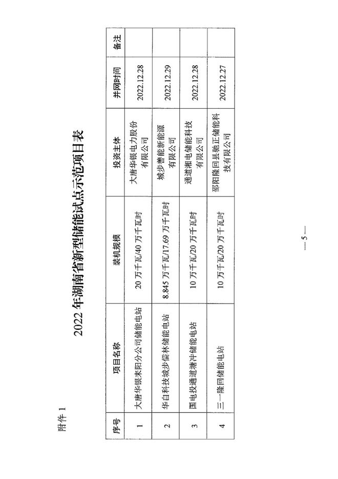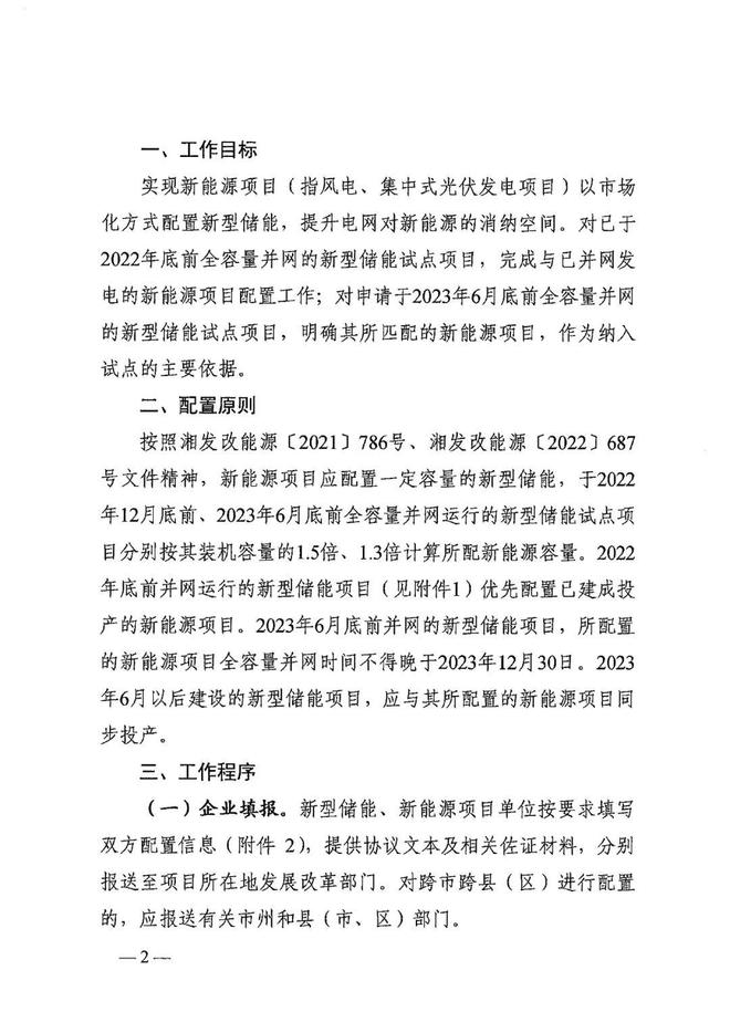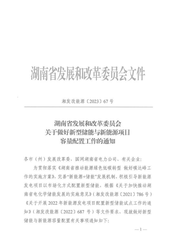 按照湖南發(fā)改委相關(guān)文件,新能源項(xiàng)目應(yīng)配置一定容量的新型儲能,于2022年12月底前,2023年6月底前全容量并網(wǎng)運(yùn)行的新型儲能試點(diǎn)項(xiàng)目分別按其裝機(jī)容量的1.5倍、1.3倍計(jì)算所配新能源容量。
