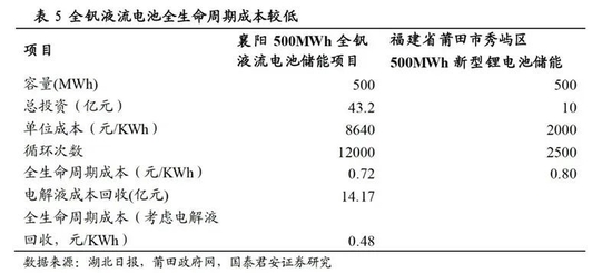 不過,釩電池儲能也有其劣勢,除了當下技術(shù)還不夠成熟之外,其初始投入也高于鋰電池等技術(shù)。國泰君安測算了襄陽500MWh全釩液流電池儲能項目與莆田500MWh新型鋰電池儲能項目的投資回收情況,在容量規(guī)模相同的情況下,前者的總投資為43.2億元,而后者為10億元。