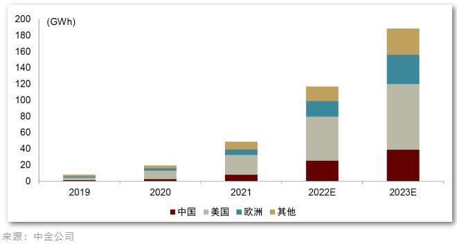 據(jù)中金公司預測,今年全球儲能需求有望達189GWh,同比增長超60%。美國、中國、歐盟成為全球三大儲能市場。