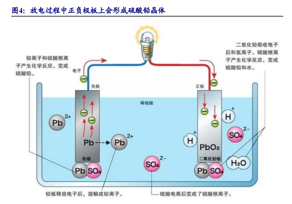 鉛酸電池包含正極板組、負極板組、隔板、電解液、容器等結(jié)構(gòu)組成。正極板 活性物質(zhì)為二氧化鉛,負極板主要活性物質(zhì)為鉛。放電過程中正負極板上會形成細 小松軟的硫酸鉛晶體,充電過程中硫酸鉛歧化為鉛與二氧化鉛。