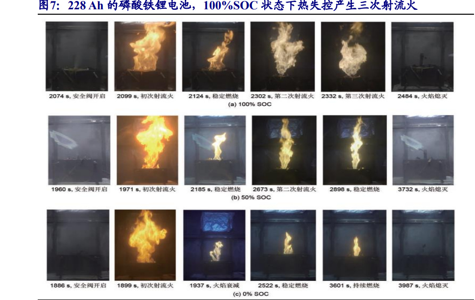 在模擬燃燒實驗中,鋰電池的燃燒過程包括受熱鼓脹、初次射流火、穩(wěn)定燃燒、 多次射流火、火焰熄滅等過程。不同 SOC(電池中剩余的電荷余量,100%為滿電)狀態(tài)下,鋰電池會產(chǎn)生 2-3 次射流火,100%狀態(tài)下熱失控溫度僅為 167℃,而燃燒 峰值溫度將達到 573℃。