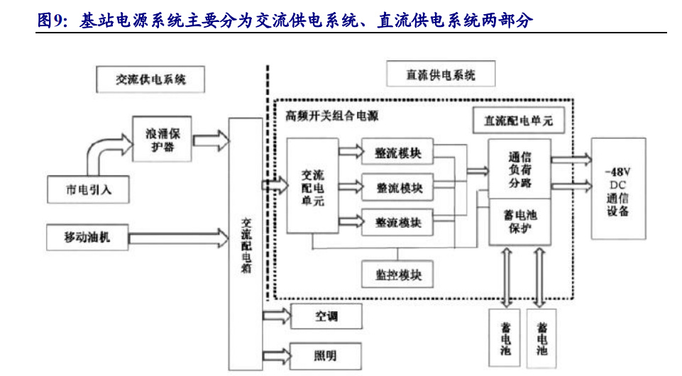 通信儲能作為通信基站的配套基礎(chǔ)設(shè)施,是保障通信系統(tǒng)實現(xiàn)可靠運行的關(guān)鍵。 開年以來,北京、上海、深圳、寧夏、大連、吉林等省市宣布 5G 基站建設(shè)目標,1 月 31 日,北京宣布將在 2023 年新建 1 萬個以上 5G 基站;2 月 8 日,寧夏宣布將在 2023 年新建 5G 基站 2000 個,累計達到 13000 個;2 月 11 日,上海計劃 2023 年新 建 1 萬個 5G 基站;2 月 10 日,深圳市工信局發(fā)布《深圳市極速先鋒城市建設(shè)行動 計劃》,計劃指出要全面提升 5G 網(wǎng)絡(luò)能效,全年新增 5G 基站 10000 個。2 月 13 日, 吉林省通信管理局公布 5G 基站相關(guān)數(shù)據(jù):2022 年建成 5G 基站 13042 個,累計建成 5G 基站 34092 個,并宣布了 2023 年目標:力爭新建 5G 基站 8000 個。2 月 14 日, 大連市通信管理局宣布全年全域?qū)⑿陆?5G 基站 4000 個以上,力爭年底建成 19000 個 5G 基站,重點場所網(wǎng)絡(luò)通達率提升至 99%。 我國 5G 基站的建設(shè)運營模式主要采用中國鐵塔建塔、引電建設(shè)基礎(chǔ)配套設(shè)施, 移動、聯(lián)通、電信三大主運營商租塔、安裝設(shè)備并進行網(wǎng)絡(luò)運營的模式,運營電費 由鐵塔代運營商統(tǒng)一向電力部門繳納。5G 基站開通后電費成本開支已高于鐵塔租費, 較大的 5G 基站耗電量已經(jīng)成為阻礙 5G 和制約行業(yè)發(fā)展的一個重要因素。利用儲能 裝置在負荷高峰時期放電,負荷低谷時期從電網(wǎng)充電,減少高峰負荷需求,節(jié)省用電費用,從而達到改善負荷特性、參與系統(tǒng)調(diào)峰的目的,同時節(jié)省電費、最大限度 套利。 基站電源系統(tǒng)主要分為交流供電系統(tǒng)、直流供電系統(tǒng)兩部分。交流供電系統(tǒng)包 含市電引入、移動油機、浪涌保護器、交流配電箱等。直流供電系統(tǒng)包含高頻開關(guān) 組合電源,蓄電池等。