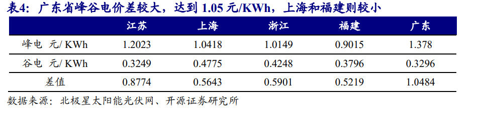 目前儲能站盈利模式的其中一類是采取峰谷電價套利模式,即儲能站在谷時充 電,峰時放電,以此補平電網(wǎng)負荷曲線的同時獲取峰谷電價差值的收益。 參考 2023 年各省電網(wǎng)企業(yè)代理購電價格來看,江蘇、上海、浙江、福建、廣東 等省為代表性較強的省份,選取谷時和高峰時段電價進行比較,上海和福建的峰谷 電價差值較小,僅為 0.56 元、0.52 元/KWh,而廣東則價差較大,達到 1.05 元/KWh。