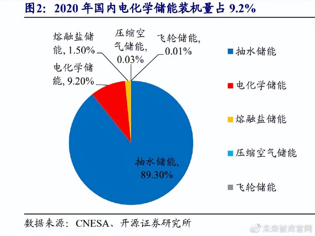 從儲能方式來看,抽水儲能為目前國內(nèi)累計裝機規(guī)模最大的蓄能方式,占比達 到了 89.3%;其次是電化學儲能,裝機規(guī)模占比為 9.2%。熔融鹽儲熱裝機規(guī)模占比為1.5%;壓縮空氣儲能和飛輪儲能裝機規(guī)模占比都小于 0.1%。電化學儲能中,鋰電池仍 為主導儲能形式,占總量 88.8%,鉛蓄電池為第二大分支,占到 10.2%。
