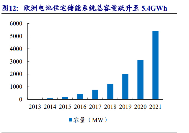 歐洲光伏產(chǎn)業(yè)協(xié)會(SolarPower Europe)數(shù)據(jù)表明,歐洲部署的住宅儲能系統(tǒng)總儲能容量在 2020 年首次突破 1GWh,而在 2021 年又增長了一倍多,達到 2.3GWh。 2021 年住宅電池儲能市場的規(guī)模是 2014 年的 35 倍。歐盟各國在 2014 年僅安裝了約 9000 套住宅電池儲能系統(tǒng),而到 2021 年,約部署了 26 萬套住宅電池儲能系統(tǒng)。歐 洲光伏產(chǎn)業(yè)協(xié)會在其“中等情景”預計 2022 年將達到 3.9GWh,將增長 71%,這將 使歐洲累計部署的住宅儲能系統(tǒng)總儲能容量達到 9.3GWh。根據(jù)該協(xié)會的預計,歐洲 在 2022 年將安裝 42 萬多塊蓄電池,這將使歐洲 100 多萬戶家庭使用住宅太陽能發(fā) 電設(shè)施和住宅電池儲能系統(tǒng)。歐洲電池儲能系統(tǒng)的電池通常是進口的,現(xiàn)在面臨著 嚴重短缺的困境。 歐洲光伏產(chǎn)業(yè)協(xié)會認為,住宅太陽能和儲能系統(tǒng)的部署熱潮將會持續(xù)下去。根 據(jù)該協(xié)會對“中等情景”的預計,到 2026 年底,歐洲將有 390 萬戶家庭部署住宅電 池儲能系統(tǒng),累計部署的儲能容量將增長 300%以上,達到 32.2GWh。而其“高等情 景”預測超過 44GWh。德國是在歐洲領(lǐng)先的住宅電池儲能市場 (2021 年占歐洲住宅 電池儲能市場份額的 59%),新建的住宅太陽能設(shè)施的電池儲能系統(tǒng)配套部署率達到 70%,并且還在進一步上升。