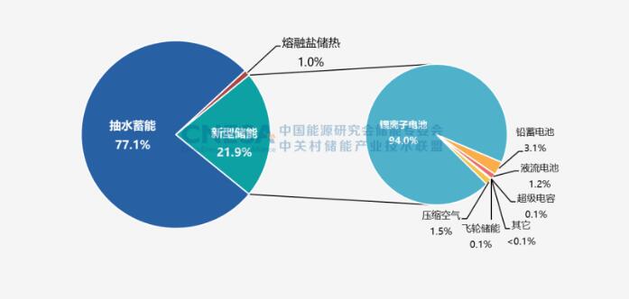 2022年,中國(guó)新增投運(yùn)電力儲(chǔ)能項(xiàng)目裝機(jī)規(guī)模首次突破15GW,達(dá)到16.5GW,其中,抽水蓄能新增規(guī)模9.1GW,同比增長(zhǎng)75%;新型儲(chǔ)能新增規(guī)模創(chuàng)歷史新高,達(dá)到7.3GW/15.9GWh,功率規(guī)模同比增長(zhǎng)200%,能量規(guī)模同比增長(zhǎng)280%;新型儲(chǔ)能中,鋰離子電池占據(jù)絕對(duì)主導(dǎo)地位,比重達(dá)97%,此外,壓縮空氣儲(chǔ)能、液流電池、鈉離子電池、飛輪等其它技術(shù)路線的項(xiàng)目,在規(guī)模上有所突破,應(yīng)用模式逐漸增多。