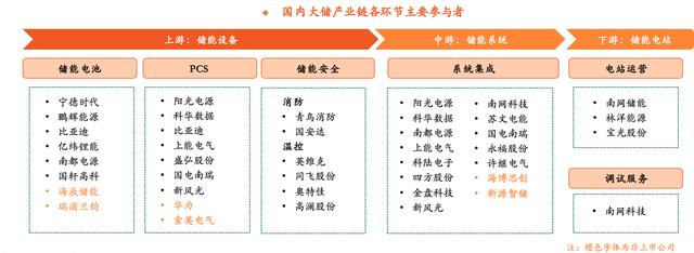 大儲(chǔ)產(chǎn)業(yè)鏈主要包括上游儲(chǔ)能設(shè)備、中游系統(tǒng)集成、下游電站等環(huán)節(jié)。儲(chǔ)能電池和PCS是大儲(chǔ)產(chǎn)業(yè)鏈價(jià)值量最大的兩個(gè)環(huán)節(jié),陳驍?shù)热苏J(rèn)為,儲(chǔ)能電池絕對(duì)龍頭寧德時(shí)代,第二梯隊(duì)比亞迪、鵬輝能源、億緯鋰能、國軒高科、南都電源、海辰儲(chǔ)能等有望借國內(nèi)大儲(chǔ)市場(chǎng)加速贏得動(dòng)力電池之外的第二成長曲線。國內(nèi)大儲(chǔ)PCS頭部企業(yè)陽光電源、科華數(shù)據(jù)、上能電氣、盛弘股份、國電南瑞、新風(fēng)光等在裝機(jī)提速+毛利改善下業(yè)績有望受益。