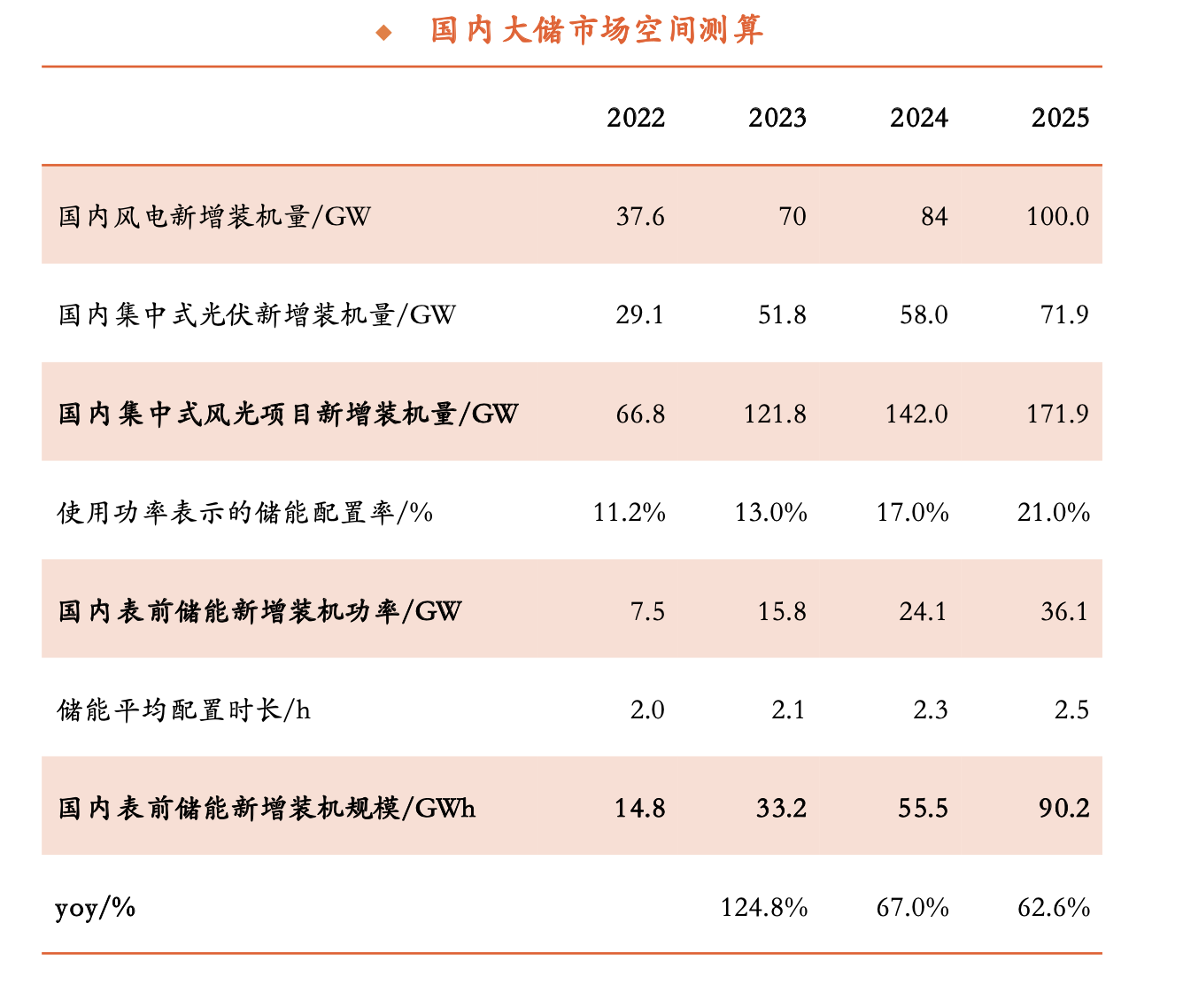 根據(jù)平安證券測(cè)算,假設(shè)2023/2024/2025年儲(chǔ)能配置率分別為13%/17%/21%,時(shí)長分別為2.1h/2.3h/2.5h。今年國內(nèi)大儲(chǔ)新增裝機(jī)有望達(dá)到33.2GWh,同比增長124.8%;到2025年,國內(nèi)大儲(chǔ)新增裝機(jī)量有望進(jìn)一步增長至90.2GWh,2022-2025年復(fù)合增長率達(dá)83%。