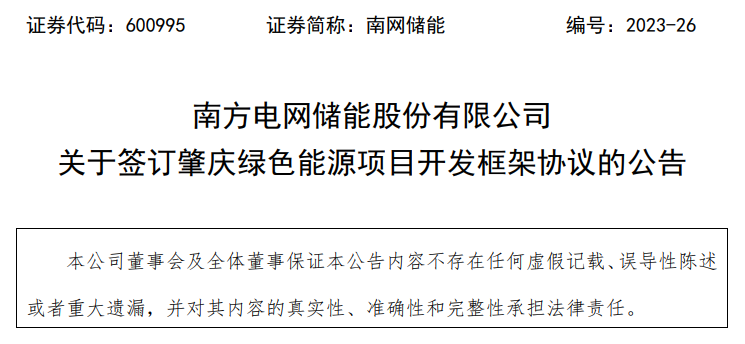 南網(wǎng)儲能于4月22日發(fā)布公告稱,南方電網(wǎng)儲能股份有限公司(乙方)于2023年4月21日與廣東省肇慶市發(fā)展和改革局(甲方)共同簽訂《肇慶綠色能源項目合作開發(fā)框架協(xié)議》。