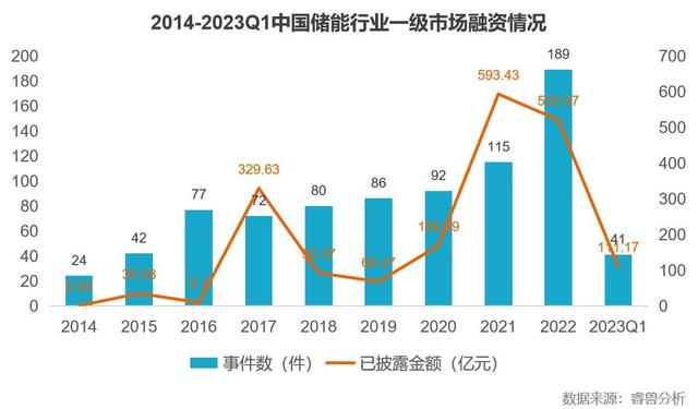 近些年國內(nèi)一級市場投融資整體呈現(xiàn)持續(xù)下滑趨勢,但儲能行業(yè)投融資熱度持續(xù)高漲。根據(jù)睿獸分析統(tǒng)計,截至2023年3月31日,國內(nèi)儲能行業(yè)有300余家企業(yè)獲得融資,涉及融資事件944件、融資金額1947億元,參與機構(gòu)達1122家。中國儲能行業(yè)在2021年、2022年迎來爆發(fā),2022年中國儲能行業(yè)融資事件189件,同比增長64.3%,融資金額520.97億元,同比下降12.2%,但仍處于高位。近10年,中國儲能行業(yè)累計獲得超1900億元融資。