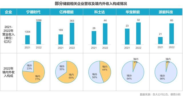 2022年是儲能出海元年,之前海外儲能市場一直被日韓品牌占據(jù),隨著海外儲能市場需求火爆,國內(nèi)儲能企業(yè)紛紛出海,目前海外儲能市場已經(jīng)成為國內(nèi)儲能企業(yè)創(chuàng)收貢獻最大的市場。根據(jù)已發(fā)布2022年度報告的儲能上市企業(yè)數(shù)據(jù),多數(shù)儲能相關(guān)企業(yè)營收獲得兩位數(shù)以上增長,其中寧德時代、億緯鋰能、派能科技等企業(yè)營收增長超過100%;企業(yè)海外市場營收增速較快,部分企業(yè)海外市場營收占比超過90%,華寶新能、派能科技境外營收比重分別達到94%和96%。