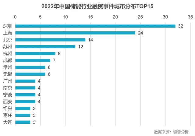 根據(jù)睿獸分析統(tǒng)計,2022年中國儲能行業(yè)融資事件遍布全國20余個省份,其中廣東、江蘇、上海三地領(lǐng)先,三省融資事件數(shù)量合計占比50.53%。從城市分布來看,深圳、上海、北京、蘇州、杭州位居全國前五位,合計占比達47.87%。