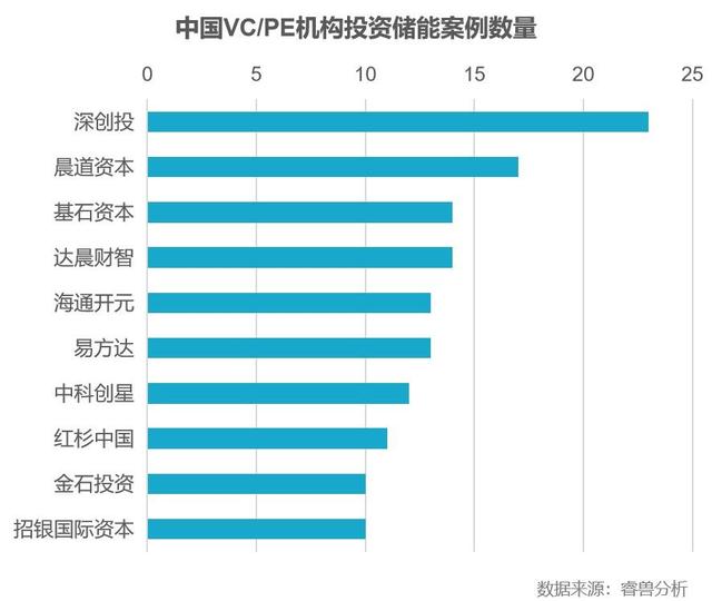 睿獸分析數(shù)據(jù)顯示,深創(chuàng)投、晨道資本、基石資本、達晨財智等VC/PE機構(gòu)投資儲能產(chǎn)業(yè)比較活躍,投資領(lǐng)域涉及上游材料、動力電池、儲能系統(tǒng)、工商業(yè)儲能、電池回收利用等領(lǐng)域,基本涵蓋儲能全產(chǎn)業(yè)鏈。