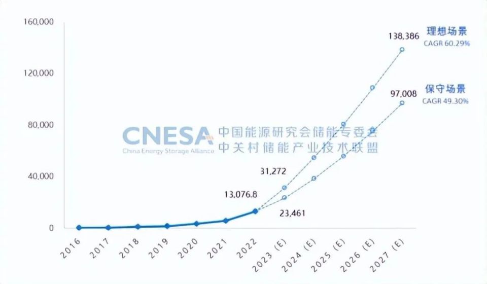 經(jīng)歷“十三五”孕育,“十四五”時期,我國新型儲能市場有望邁上新臺階。2021開始,我國新型儲能從商業(yè)化初期向規(guī)?;l(fā)展,根據(jù)CNESA預(yù)測,在未來5年,“新能源+儲能”是新型儲能的主要應(yīng)用場景,政策推動將構(gòu)成中國儲能市場的主要增長動力;根據(jù)中國能源研究會儲能專委會/中關(guān)村儲能產(chǎn)業(yè)技術(shù)聯(lián)盟(CNESA)全球儲能數(shù)據(jù)庫的不完全統(tǒng)計,截至2022年底,國內(nèi)已投運的電力儲能項目累計裝機達59.8GW,占全球市場總規(guī)模的25%,年增長率38%,其中新型儲能持續(xù)高速發(fā)展,累計裝機規(guī)模首次突破10GW,累計裝機規(guī)模首次突破10GW,達到13.1GW/27.1GWh。未來5年,“新能源+儲能”是新型儲能的主要應(yīng)用場景,政策推動是主要增長動力;根據(jù)中關(guān)村儲能產(chǎn)業(yè)技術(shù)聯(lián)盟(CNESA)對我國新型儲能未來5年市場規(guī)模的預(yù)測,保守場景下,預(yù)計2027年新型儲能累計規(guī)模將達到97.0GW,2023-2027年復(fù)合年均增長率(CAGR)為49.3%;理想場景下,預(yù)計2027年新型儲能累計規(guī)模將達到138.4GW,2023-2027年復(fù)合年均增長率(CAGR)為60.3%。預(yù)計未來5年,年度新增儲能裝機呈平穩(wěn)上升趨勢。保守場景下,年平均新增儲能裝機為16.8GW;理想場景下,年平均新增儲能裝機為25.1GW。