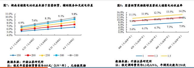 并且在容量租賃獎勵為1.3倍和1.5倍時,其資本金收益率能夠放大至11.1%與13.5%??紤]到當前湖南省仍存在較大的電 網(wǎng)側(cè)儲能裝機缺口,調(diào)峰服務(wù)輔助頻次和價格均有望實現(xiàn)較大的提升,在不考慮容量租賃獎勵的情況下,其資本金收益在年調(diào)用次 數(shù)為330次,調(diào)峰輔助服務(wù)收益為0.4元/kWh的情況下,其資本金收益率能夠達到9.8%。隨著電力輔助服務(wù)種類增多和電力現(xiàn)貨市場 的開展,其收益方式有望進一步增加。同時儲能電站的收益在一定程度上依賴電站運營商自身的運營水平,隨著儲能電站運營商的 經(jīng)驗積累,收益能力有望進一步提升。