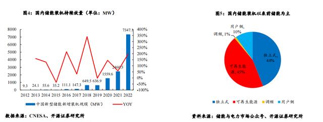 國內(nèi)儲能裝機有望持續(xù)增長,表前儲能為裝機主力。根據(jù)CNESA數(shù)據(jù)統(tǒng)計,2012-2022年間國內(nèi)新型儲能新增裝機復(fù)合增 速高達95%。2022年國內(nèi)新型儲能新增裝機高達7.3GW,同比增長近200%。就國內(nèi)儲能裝機類型分布而言,根據(jù)儲能與 電力市場公眾號統(tǒng)計,可再生能源配儲與獨立儲能裝機占比分別為45%與44%,用于調(diào)頻的裝機占比僅為1%,工商業(yè)用 戶側(cè)儲能裝機占比10%。我國當前的儲能類型主要還是以用于配套新能源裝機的表前儲能裝機為主。