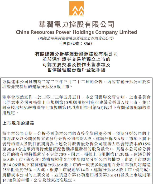 6月18日,華潤(rùn)電力發(fā)布《有關(guān)建議分拆華潤(rùn)新能源控股有限公司并于深圳證券交易所獨(dú)立上市的可能主要交易及視作出售事項(xiàng)及暫停辦理股份過(guò)戶登記手續(xù)》。
