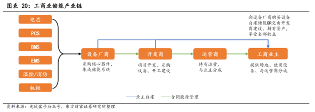 東方財富證券認(rèn)為,工商業(yè)儲能產(chǎn)業(yè)鏈中,核心變量在于開發(fā)商和運營商,目前的競爭格局呈現(xiàn)出百花齊放的局面,而開發(fā)商和運營商的競爭重點在于市場開拓能力。