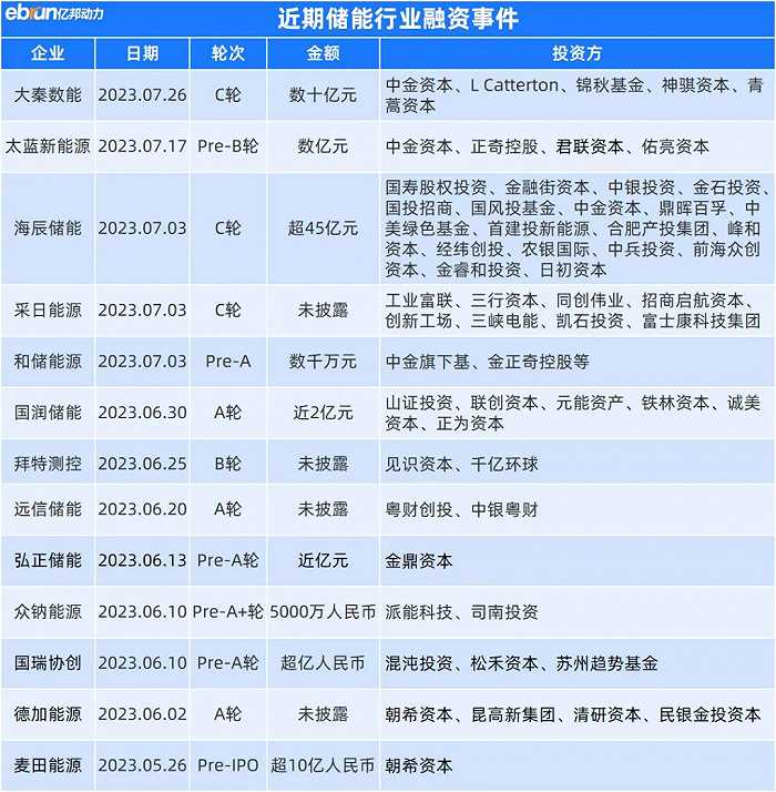 7月5日,海辰儲(chǔ)能完成C輪融資,由國(guó)壽股權(quán)和金融街資本共同領(lǐng)投,金額超45億元,是已知目前儲(chǔ)能行業(yè)2023年金額最大的一筆融資。海辰儲(chǔ)能是一家從事鋰電池核心材料、磷酸鐵鋰儲(chǔ)能電池及系統(tǒng)的研發(fā)、生產(chǎn)和銷售業(yè)務(wù)的企業(yè)。7月3日證監(jiān)會(huì)發(fā)布公告顯示,海辰儲(chǔ)能上市輔導(dǎo)備案已獲受理,正式進(jìn)入IPO上市流程。