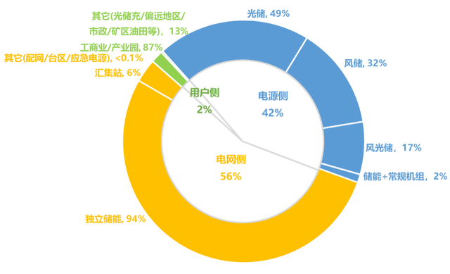 中國新增投運(yùn)新型儲能項目應(yīng)用裝機(jī)分布(2023年1-6月份,MW%)