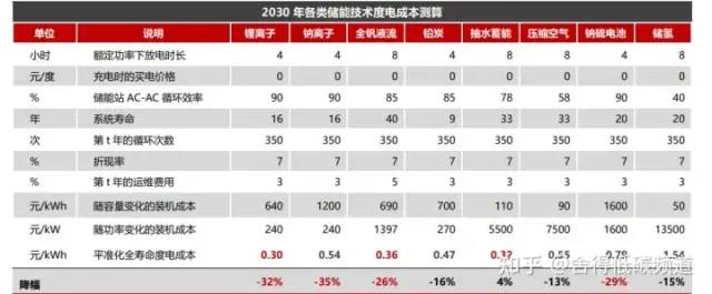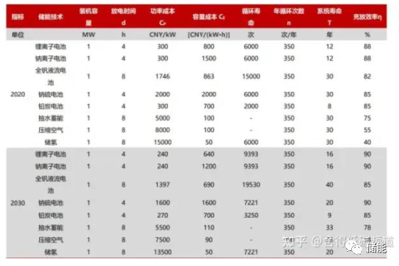 為了對比各類儲能技術(shù)度電成本的變化趨勢,首先對各類技術(shù)到 2030 年的儲 能容量、能量單元成本、使用壽命、充放電效率等進(jìn)行假設(shè):