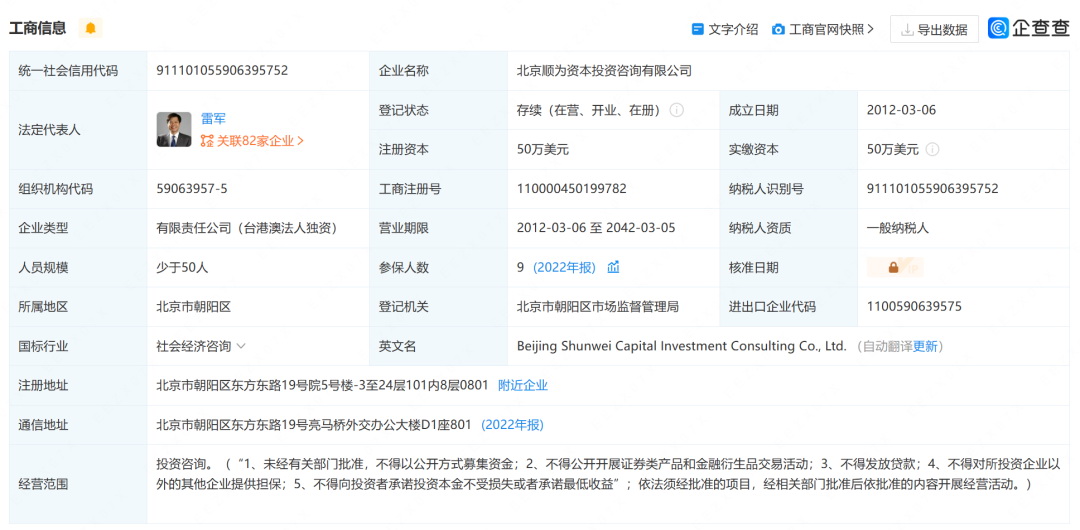 資料顯示,順為資本的機(jī)構(gòu)主體是北京順為資本投資咨詢有限公司,由雷軍先生和許達(dá)來先生創(chuàng)立于2011年,法定代表人為小米集團(tuán)董事長(zhǎng)雷軍。
