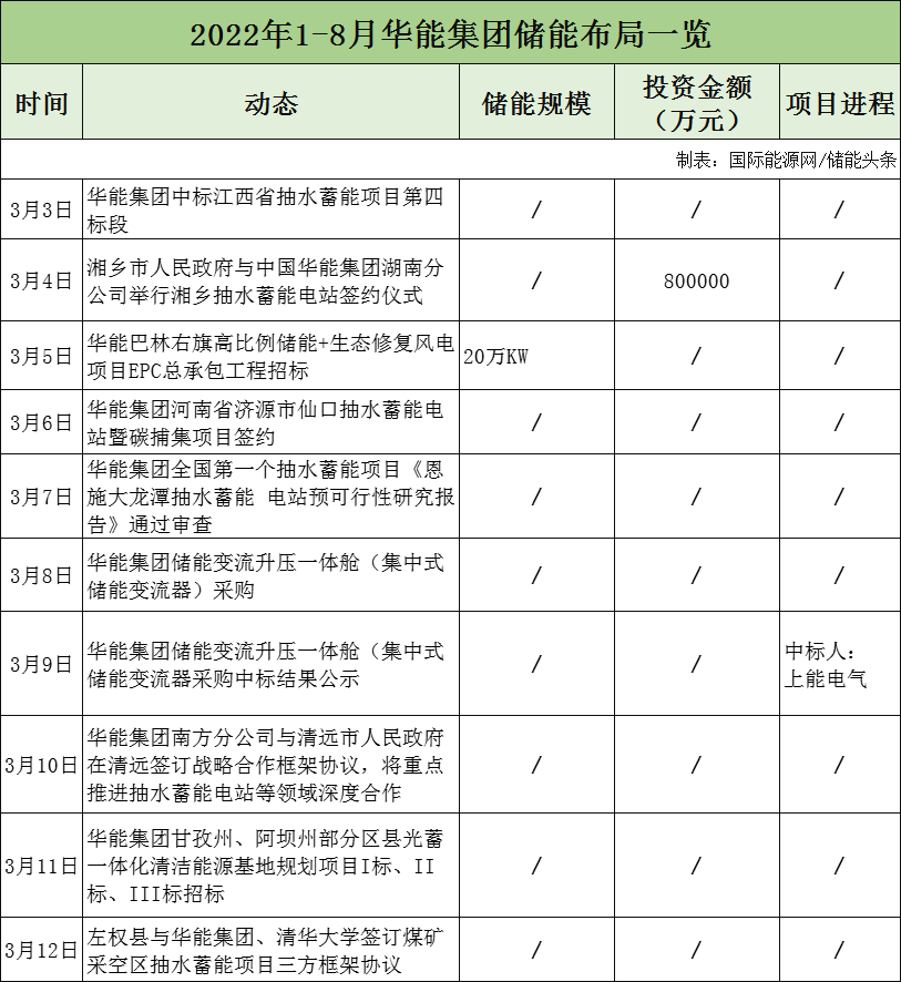 2022年,華電集團成立新能源公司從事儲能技術(shù)服務(wù)等業(yè)務(wù),并開啟磷酸鐵鋰電化學(xué)儲能系統(tǒng)集采。儲能項目招標6個,均為抽水蓄能項目。