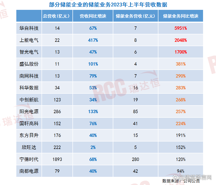 從下表中的部分儲(chǔ)能企業(yè)公布的儲(chǔ)能業(yè)務(wù)營(yíng)收及其增速數(shù)據(jù)可以看出,2023年上半年的儲(chǔ)能產(chǎn)業(yè)已經(jīng)迎來明顯的爆發(fā)增長(zhǎng)期,其中華自科技、上能電氣、智光電氣三家企業(yè)的儲(chǔ)能業(yè)務(wù)營(yíng)收增速分別達(dá)到5951%、2048%、1700%。而從總營(yíng)收增速與儲(chǔ)能業(yè)務(wù)營(yíng)收增速的對(duì)比也能看出,后者顯著高于前者,即儲(chǔ)能業(yè)務(wù)或成儲(chǔ)能相關(guān)企業(yè)2023年?duì)I收增速的主要來源。