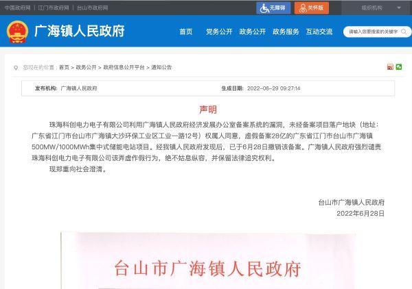臺(tái)山市廣海鎮(zhèn)人民政府在2022年6月28日發(fā)布的一則聲明顯示:珠??苿?chuàng)電力電子有限公司(目前已更名為“珠??苿?chuàng)儲(chǔ)能科技有限公司”)利用廣海鎮(zhèn)人民政府經(jīng)濟(jì)發(fā)展辦公室備案系統(tǒng)的漏洞,未經(jīng)備案項(xiàng)目落戶(hù)地塊權(quán)屬人同意,虛假備案28億的廣東省江門(mén)市臺(tái)山市廣海鎮(zhèn)500MW/1000MWh集中式儲(chǔ)能電站項(xiàng)目。聲明稱(chēng),該鎮(zhèn)已于2022年6月28日撤銷(xiāo)該備案。