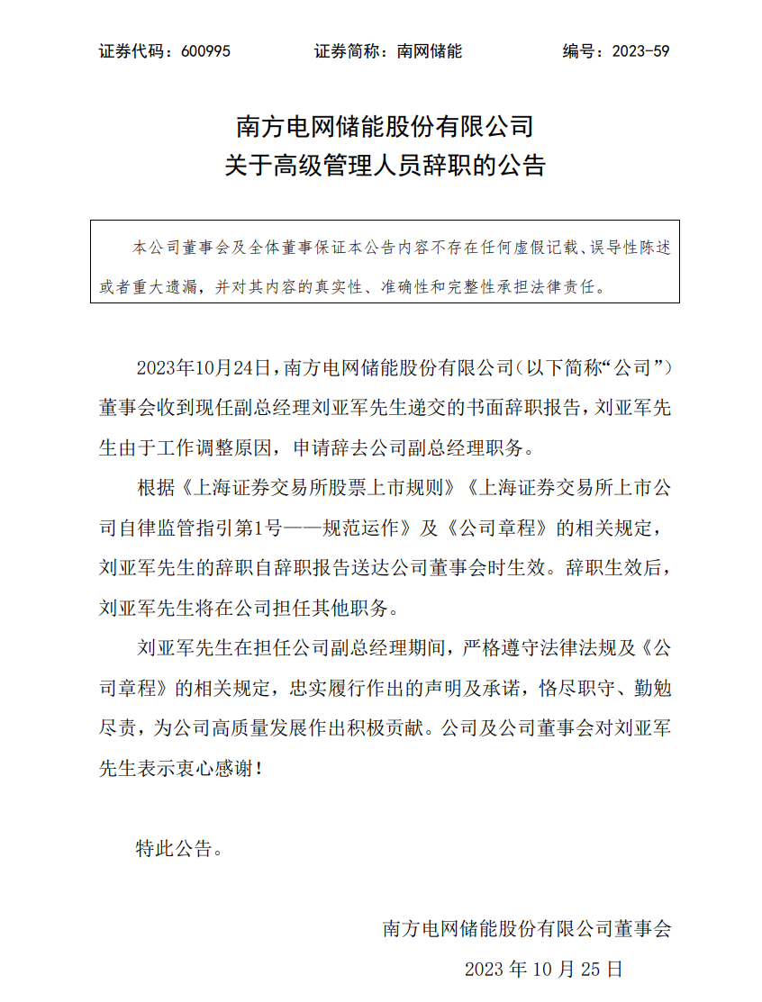 南網(wǎng)儲能公告稱,10月24日,公司董事會收到現(xiàn)任副總經(jīng)理劉亞軍先生遞交的書面辭職報告,劉亞軍先生由于工作調(diào)整原因,申請辭去公司副總經(jīng)理職務。