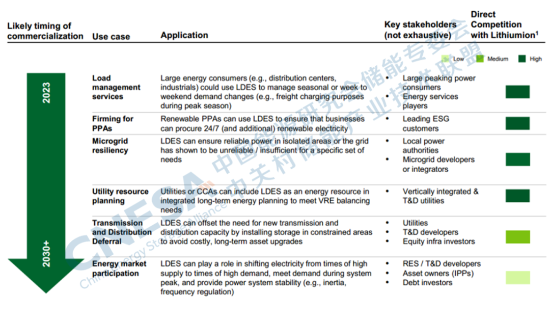 從應(yīng)用場景上講,LDES在用電負荷管理,電力購買協(xié)議,微網(wǎng)韌性和電力資源規(guī)劃等應(yīng)用場景與鋰電有較強的競爭關(guān)系,而在推遲輸配電網(wǎng)建設(shè)和參加電力市場方面的競爭關(guān)系相對較弱。