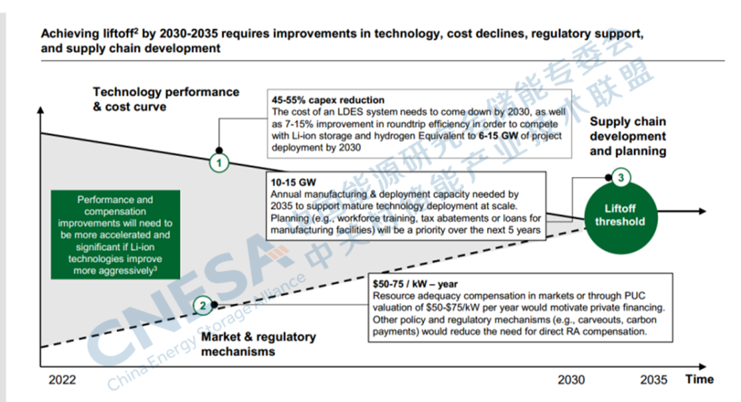 備注:圖中PUC代表公共事業(yè)委員會,RA代表資源充足。起飛點被定義為LDES行業(yè)成為一個很大程度上自我維持的市場;在鋰離子電池競爭的情況下,仍然需要多日/周的LDES技術(shù),而積極的鋰離子電池將減少供應(yīng)鏈建設(shè)的需求。