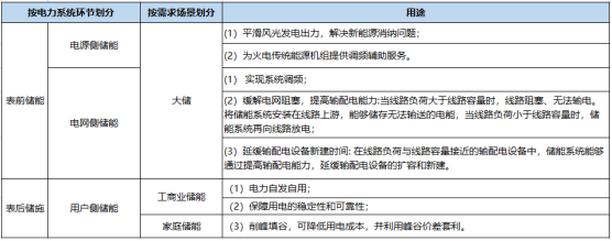 目前,儲(chǔ)能技術(shù)主要應(yīng)用于電力系統(tǒng)。具體而言,可以將儲(chǔ)能技術(shù)在電力系統(tǒng)中的典型應(yīng)用場(chǎng)景劃分為電源側(cè)、電網(wǎng)側(cè)和用戶(hù)側(cè)三個(gè)方面。其中電源側(cè)、電網(wǎng)側(cè)儲(chǔ)能又稱(chēng)為表前儲(chǔ)能或大儲(chǔ),用戶(hù)側(cè)儲(chǔ)能又稱(chēng)為表后儲(chǔ)能。用戶(hù)側(cè)儲(chǔ)能分為工商業(yè)儲(chǔ)能與戶(hù)儲(chǔ),兩者區(qū)別在于客戶(hù)群體。