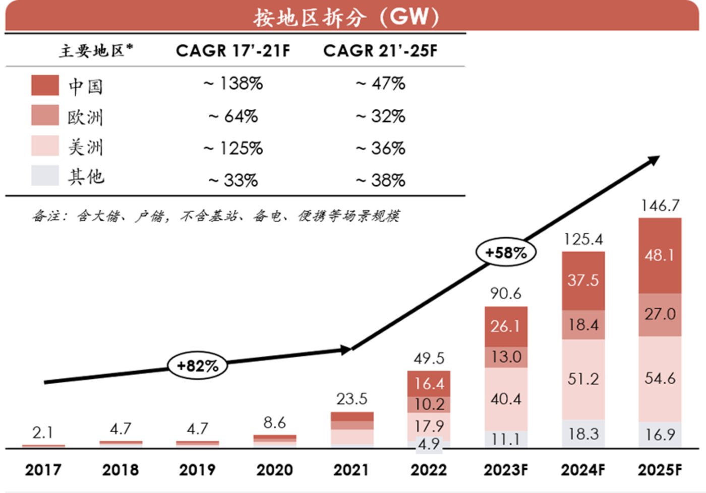 實(shí)際上,電化學(xué)儲能行業(yè)依然增長不錯。國內(nèi)的新增裝機(jī)量翻倍,美國、歐洲整體增速也在50%左右。這三個地區(qū)占全球比例達(dá)到86%,基本代表了全球行業(yè)狀況。而這個增速,已經(jīng)讓許多行業(yè)流口水了。