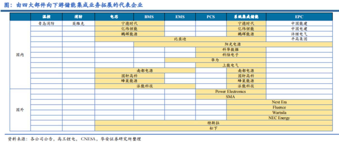 比如寧德時代、億緯鋰能等公司從電池進(jìn)入系統(tǒng)集成;陽光電源、科陸電子、上能電氣從PCS進(jìn)入系統(tǒng)集成等。也有比亞迪這樣電芯、PCS、BMS、EMS、系統(tǒng)集成全產(chǎn)業(yè)鏈布局的一體化。