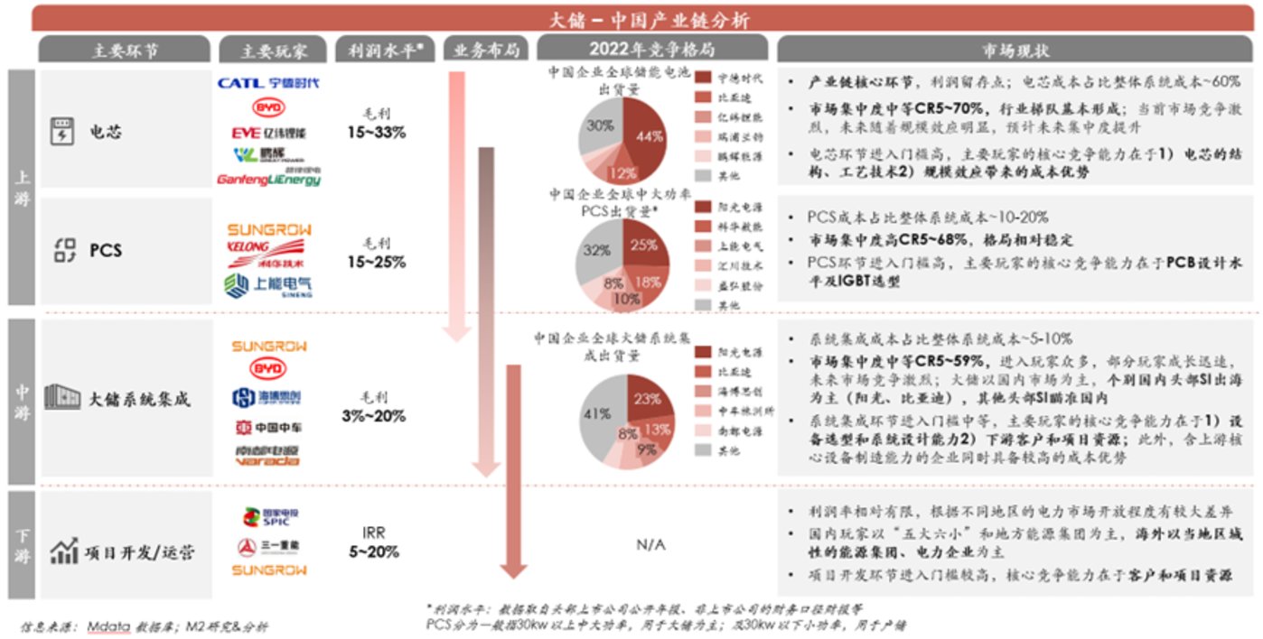 覓途咨詢的調(diào)研顯示,在大儲系統(tǒng)的價值鏈中,上游設(shè)備制造環(huán)節(jié)是核心的利潤留存點(diǎn),技術(shù)壁壘高,新玩家難以進(jìn)入市場;中游系統(tǒng)集成環(huán)節(jié)玩家眾多,市場競爭激烈,核心競爭點(diǎn)在客戶和項(xiàng)目資源開發(fā)能力,僅有個別頭部玩家以出海業(yè)務(wù)為主;未來伴隨運(yùn)營市場成熟IRR提升,更多企業(yè)將向下滲透。