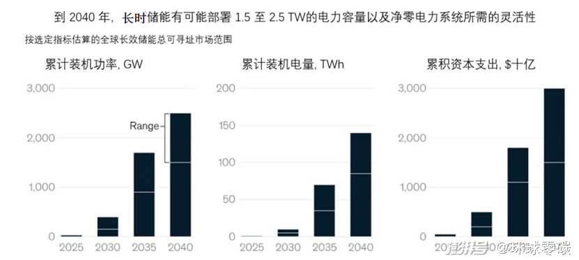 2021年,全球知名咨詢公司麥肯錫和長(zhǎng)期儲(chǔ)能協(xié)會(huì)(LDES)發(fā)布的一份報(bào)告表示,到2040年,LDES 有可能在全球部署 1.5 至 2.5 TW)(太瓦)的裝機(jī)容量,是當(dāng)前部署的總儲(chǔ)能容量的8到15倍。對(duì)應(yīng)的儲(chǔ)能容量是 85-140TWh)(太瓦時(shí) )。