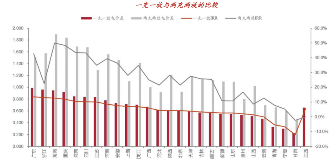 經濟性分析:我們以容量1MWh、循環(huán)次數(shù)為6000次的儲能系統(tǒng),浙江的峰谷電價為例,假設年運行天數(shù)為300天,單位投資為1.58元/Wh,充放電深度為90%,充、放電效率均為92%,考慮業(yè)主完全自建模式,不考慮資金成本,2充2放下(實際充放電次數(shù)假設為1.5),計算得IRR為22%,投資回收期為4.5年,儲能LCOS為0.49元/kWh。1充1放下,計算得IRR為8.86%,投資回收期為13年,儲能LCOS為0.72元/kWh。