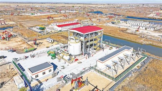 遼河油田電熱熔鹽儲(chǔ)能注汽試驗(yàn)站:世界首座電熱熔鹽儲(chǔ)能注汽試驗(yàn)站。目前常見的熔鹽儲(chǔ)能方式是把光熱或谷電、綠電轉(zhuǎn)化為熱能儲(chǔ)存在熔鹽中,再通過全天連續(xù)釋放熱能與純凈水換熱產(chǎn)生過熱蒸汽用于發(fā)電。該試驗(yàn)站通過獨(dú)創(chuàng)的蒸汽發(fā)生系統(tǒng),將油田開采過程中產(chǎn)生的污水凈化軟化后與高溫熔鹽換熱,產(chǎn)生的濕飽和蒸汽直接用于油田生產(chǎn),可有效減少能量轉(zhuǎn)換過程中的消耗。該試驗(yàn)站每年可生產(chǎn)蒸汽4.8萬噸,替代天然氣313萬立方米,減排二氧化碳6768噸。(羅前彬 整理)