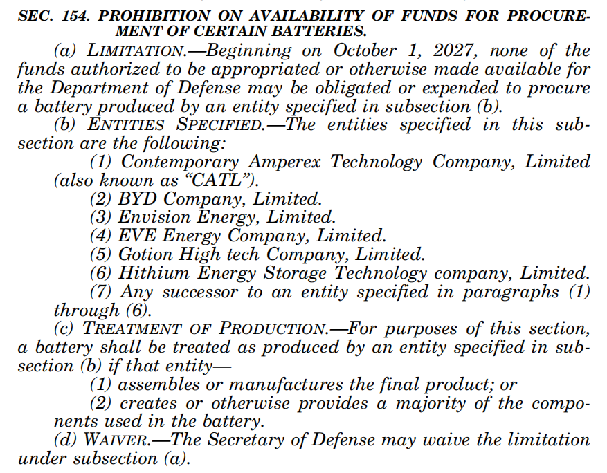 報(bào)道稱(chēng),根據(jù)美國(guó)去年年底通過(guò)的2024財(cái)年國(guó)防授權(quán)法案,美國(guó)國(guó)防部將被禁止從寧德時(shí)代、比亞迪、遠(yuǎn)景能源、億緯鋰能、國(guó)軒高科、海辰儲(chǔ)能等6家中國(guó)企業(yè)采購(gòu)電池。該禁令將于2027年10月生效。不過(guò),這項(xiàng)禁令并不適用于商業(yè)采購(gòu),比如美國(guó)福特公司正從寧德時(shí)代獲得技術(shù)許可,在密歇根州生產(chǎn)電動(dòng)汽車(chē)電池,特斯拉公司的部分電池也來(lái)自比亞迪。