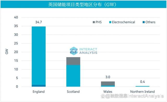 英國(guó)是全球重要的新型儲(chǔ)能市場(chǎng),與德意等以戶儲(chǔ)為主的歐洲國(guó)家不同,大規(guī)模儲(chǔ)能在英國(guó)占據(jù)主導(dǎo)地位。據(jù)Interact Analysis全球儲(chǔ)能項(xiàng)目統(tǒng)計(jì),截至2023年底,英國(guó)儲(chǔ)能項(xiàng)目總規(guī)模約55GW(含在規(guī)劃、在建及已投運(yùn)的儲(chǔ)能項(xiàng)目),其中規(guī)劃及在建項(xiàng)目50GW。抽水蓄能項(xiàng)目總規(guī)模約6.7GW,新型儲(chǔ)能項(xiàng)目規(guī)模超48GW。