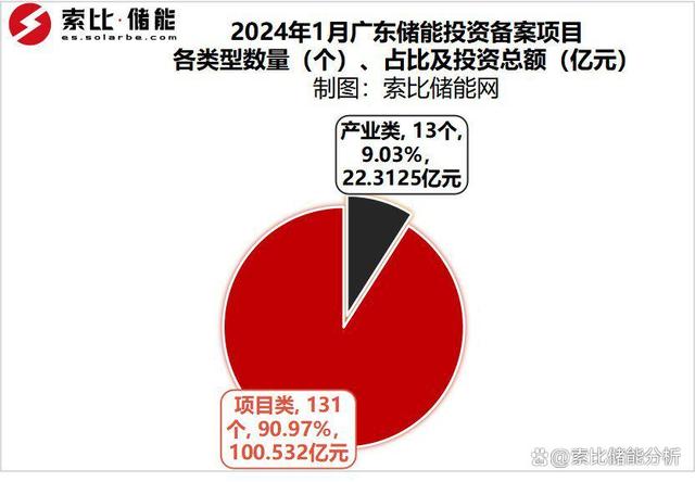 據(jù)索比儲(chǔ)能網(wǎng)不完全統(tǒng)計(jì),2024年1月,廣東省儲(chǔ)能投資備案項(xiàng)目144個(gè),總投資金額達(dá)122.8444995億元。其中產(chǎn)業(yè)類項(xiàng)目13個(gè),投資額22.3125億元;項(xiàng)目類131個(gè),規(guī)模為2723.523MW/ 5727.044MWh,投資金額100.5319995億元。